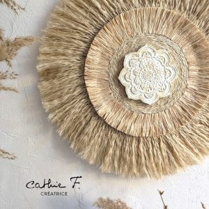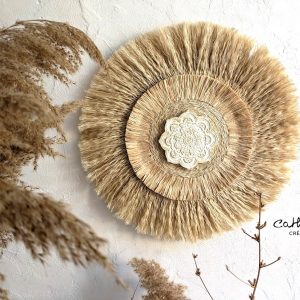 Apportez une touche bohème chic à votre intérieur avec cette décoration murale en fibres et raphia artisanale dorée, modulable pour personnaliser chaque espace avec