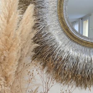 Suspendu dans une chambre ou un coin de salon, ce miroir invite à la contemplation, fusionnant la beauté rayonnante de la nature avec l'élégance bohème dans une harmonie