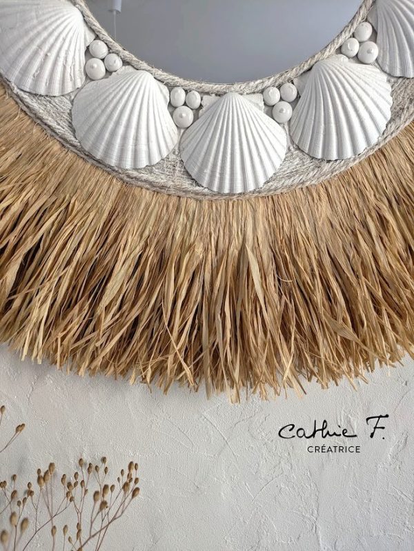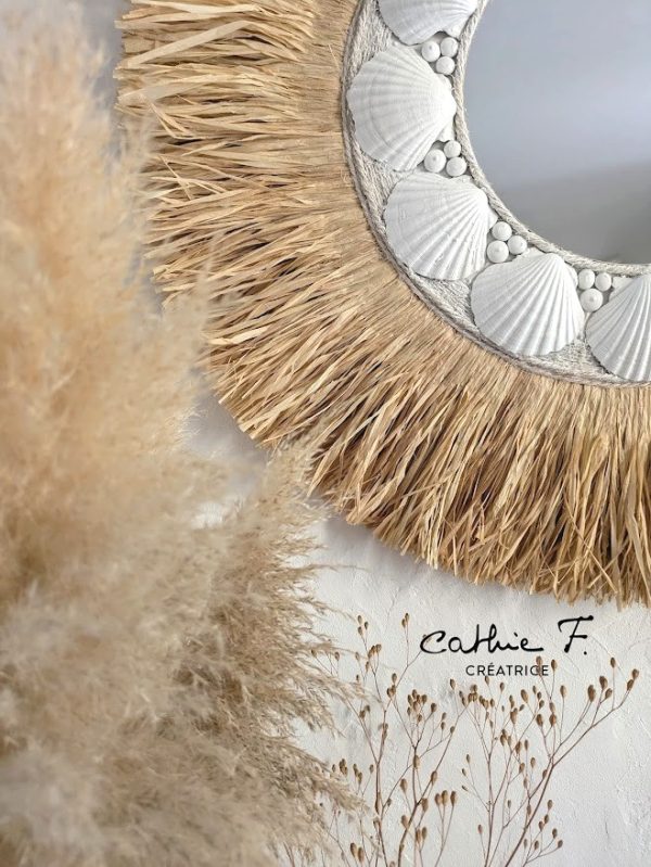 Invitez une atmosphère douce et lumineuse avec ce miroir bohème chic rond, soigneusement façonné à la main dans mon atelier. Paré de raphia et coquillages, il charme par sa silhouette arrondie, symbole d’harmonie et de légèreté.