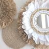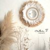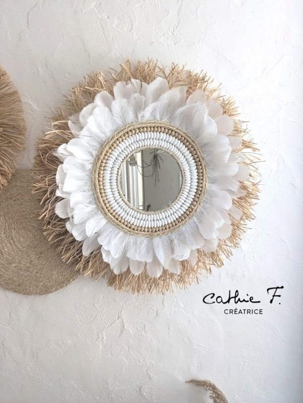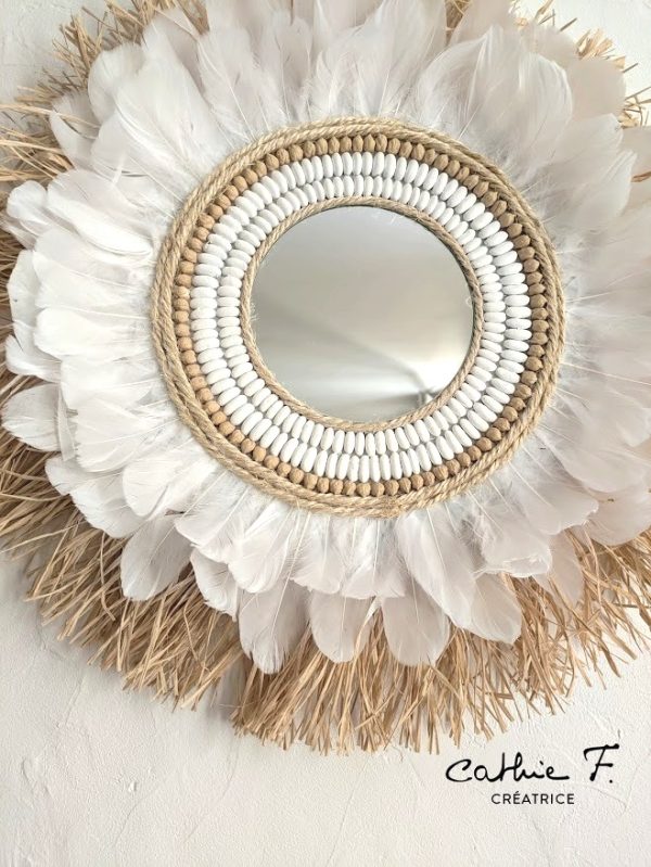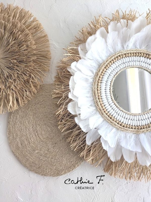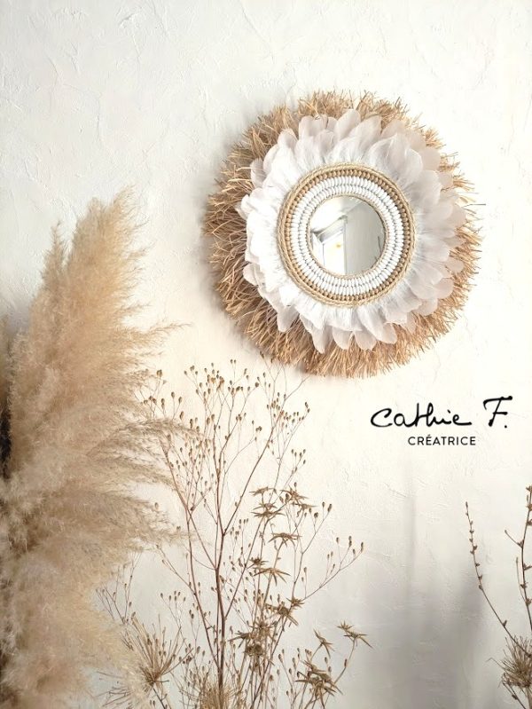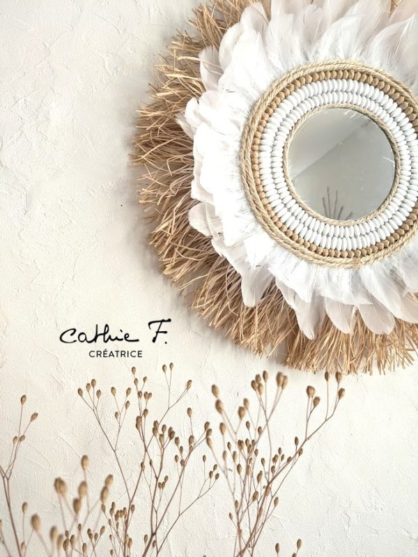 Apportez une note d’évasion et d’authenticité à votre intérieur avec ce miroir décoratif bohème chic. Confectionné à la main, il associe harmonieusement le raphia naturel, les plumes blanches délicates et une décoration originale en légumineuses, pour un rendu à la fois naturel et raffiné.
