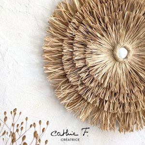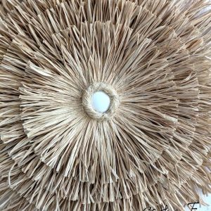 Cette décoration murale ronde trouée en raphia est une pièce artisanale où le raphia est travaillé de manière aplatie.